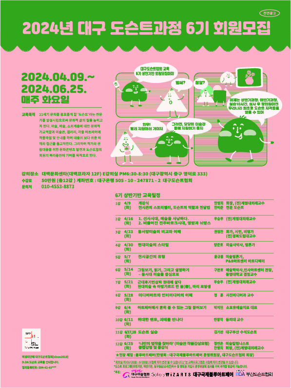 기간 : 2024년 4월 9(화) ~ 6월 25일(화) 매주 화요일 PM 6:30 ~ 8:30.